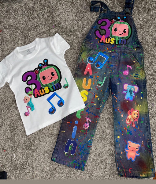Celebrate your child’s big day with a one-of-a-kind birthday outfit designed just for them! 🎉 This personalized birthday outfit set includes a custom t-shirt and matching denim overalls decorated with your child’s name, age, and their favorite colorful characters.