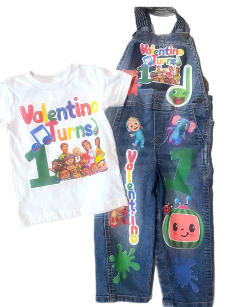 This custom boys birthday overall denim set includes a personalized shirt and matching denim overalls, designed to fit any theme you choose. Each set is custom-made to bring your child’s vision to life for their special day.